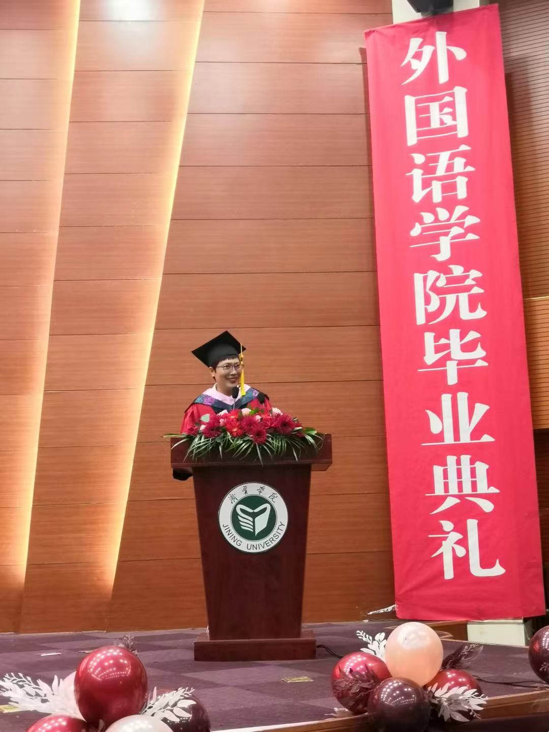 2017级英语(跨境电商)专业易彤代表本科毕业生发言,回忆了济园生活的点滴,讲述了自己求学中的成长经历,总结了自己的心路历程,表达了对学院和老师们的感激之情,表示将继续努力,不断提升自我。2018级英语教育专业宋乐代表专科生发言,讲述了在外院的学习经历,丰富多彩的校园生活锤炼品格、开阔视野,他感谢老师们始终言传身教为学生树立榜样,表达了对母校的眷恋与惜别。