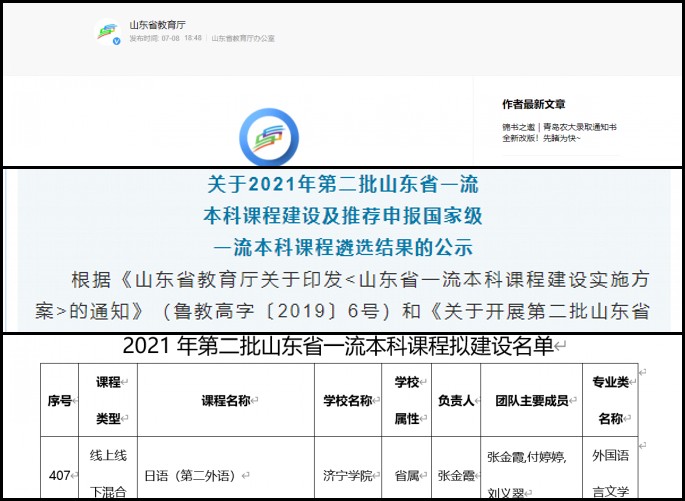 7月8日,山东省教育厅公布《关于2021年第二批山东省一流本科课程建设及推荐申报国家级一流本科课程遴选结果》。经学校推荐、形式审查、专家评审,综合各类型课程申报情况,省教育厅拟确定884门课程为第二批山东省一流本科课程。在团队成员的共同努力下,我院张金霞老师主讲的《日语(第二外语)》获批省级一流线上线下混合课程。