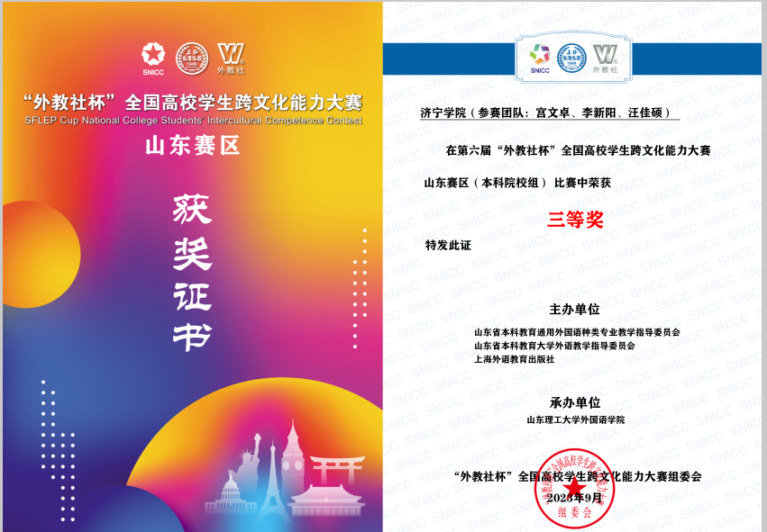 近日,第六届“外教社杯”全国高校学生跨文化能力大赛(本科院校组)山东赛区复赛和决赛在山东理工大学举办。mksport登录入口宫文卓、汪佳硕、李新阳三位同学获得山东赛区三等奖。