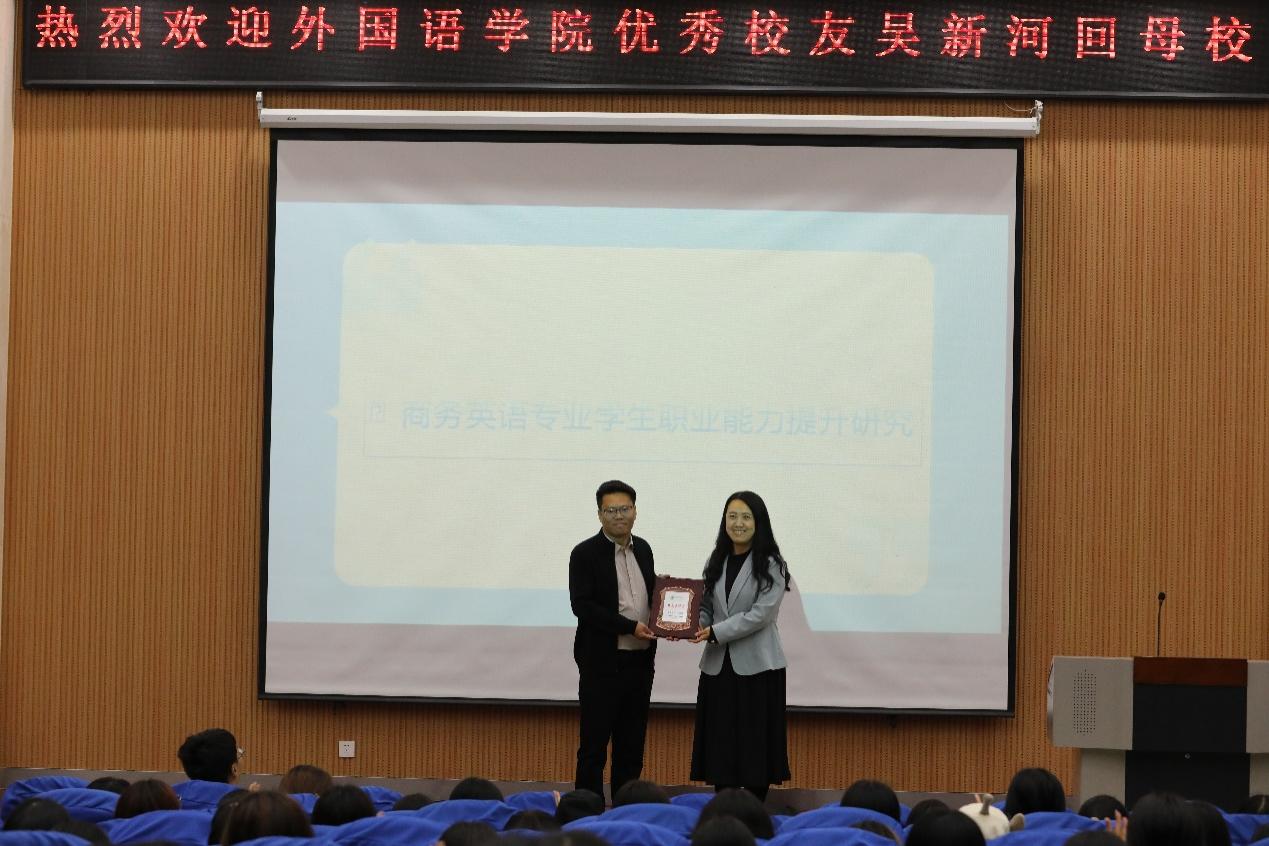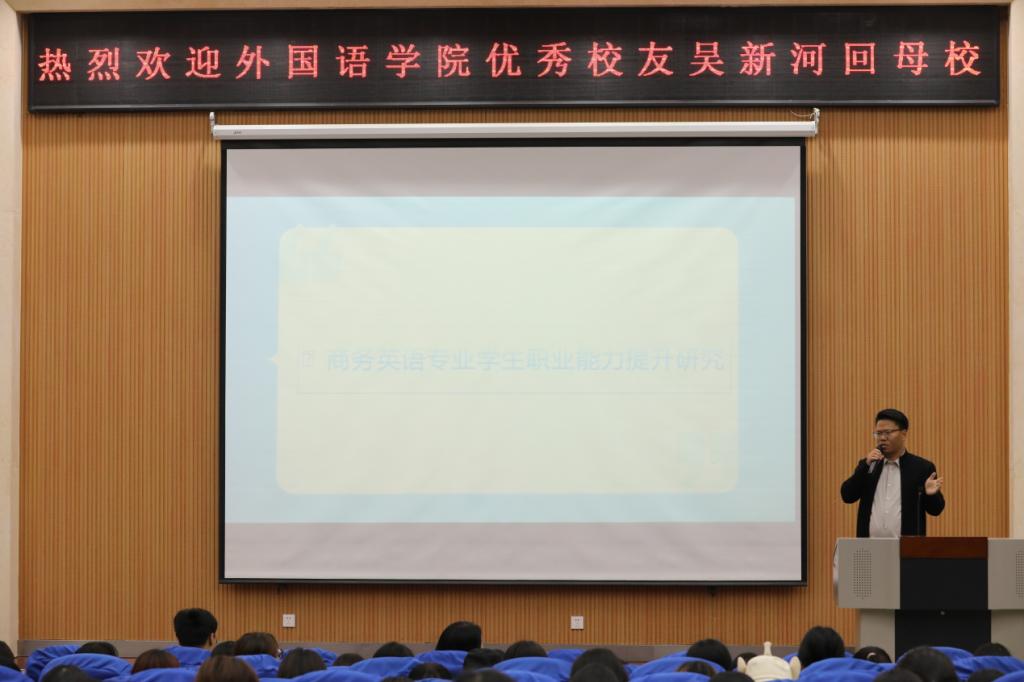 通过本次报告,吴新河校友用自己真实、丰富的经历让同学们站在创业人的角度认识到了商务英语专业的职业素养,感受到了商务英语的学科魅力,明确了自己学业规划的方向,对同学们的职业规划、人生之路都有所启迪。
