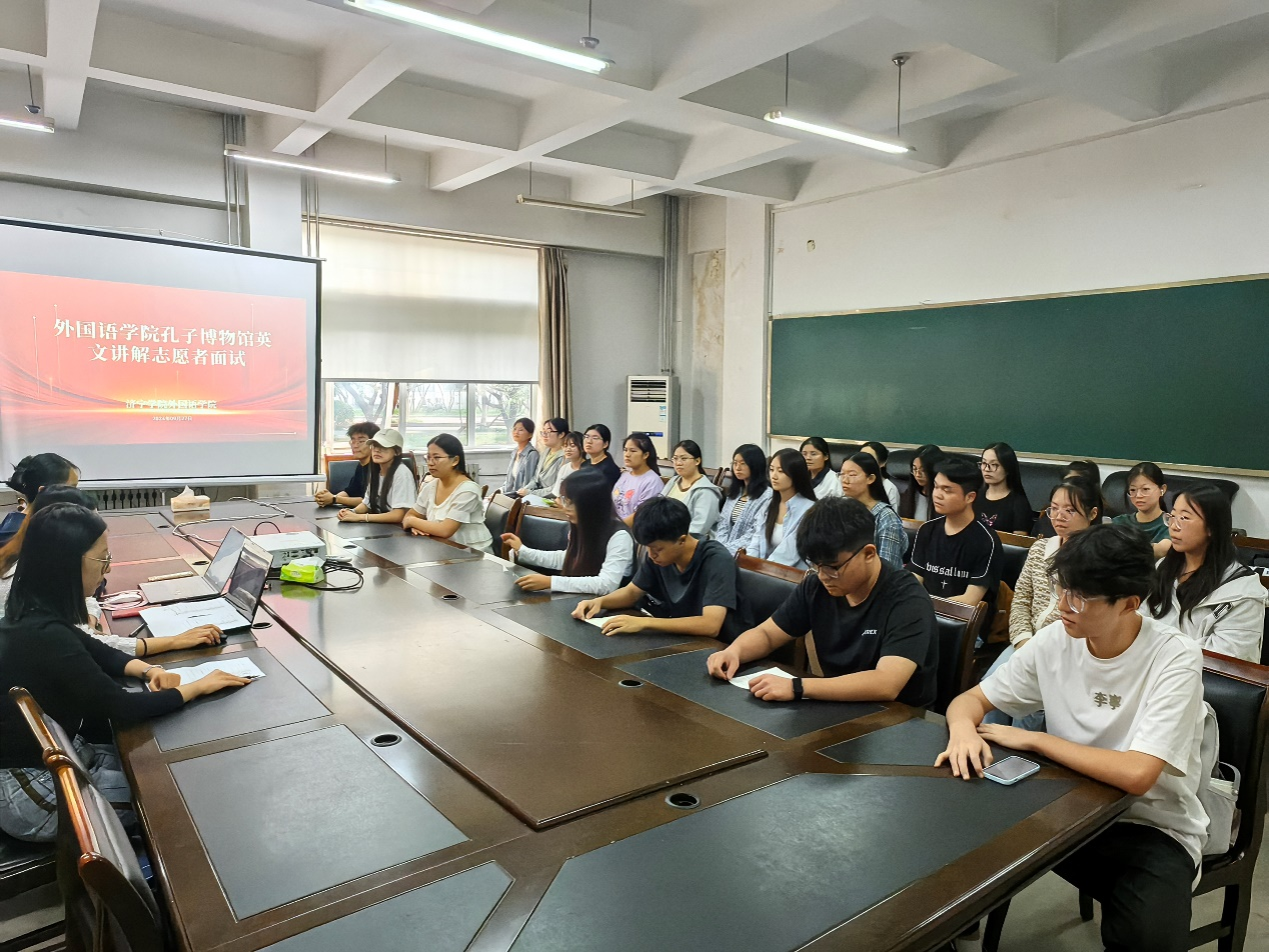 为进一步提升孔子博物馆英文讲解志愿者的综合素质,选拔出具备优秀文化素养和出色英语表达能力的英文讲解志愿者,为儒家文化传播注入新的活力,为2024中国国际孔子文化节贡献外语力量,9月27日,mksport登录入口孔子博物馆英文讲解志愿者面试活动在学院一楼会议室举行。面试由辅导员段明月主持,教师刘义翠和全体志愿者参加。