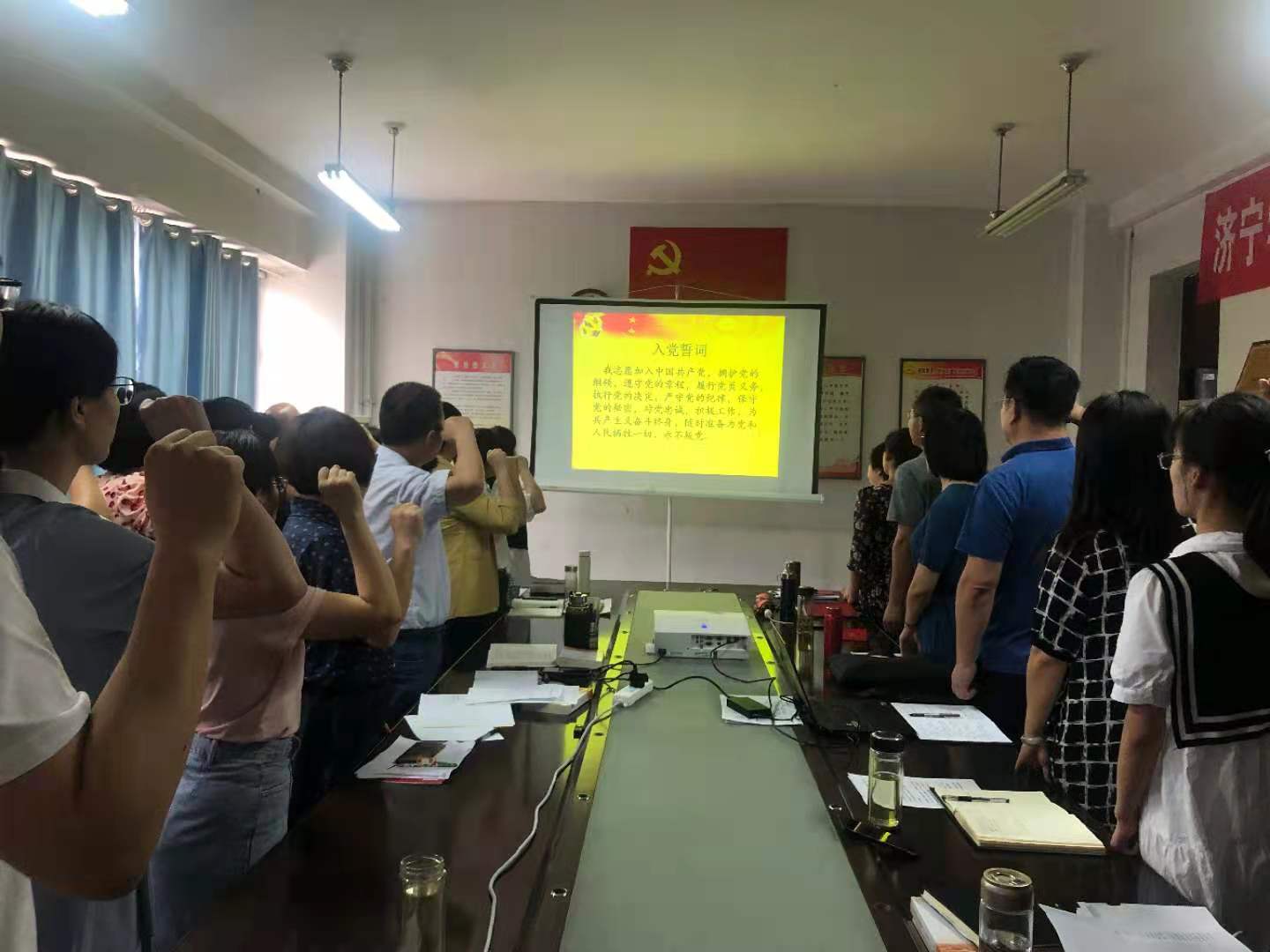 第三项活动是重温入党誓词。首先由新发展党员闫彩霞同志进行入党宣誓,然后由教工党支部书记吴瑞民同志带领全体党员重温了入党誓词,全体党员面对鲜红的党旗,庄严地举起右手,在党旗下又一次接受了心灵的净化和洗礼。