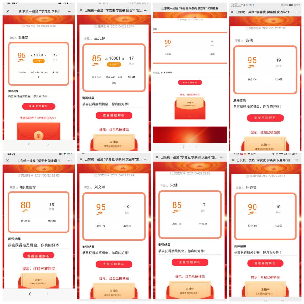 为庆祝中国共产党成立100周年,为更好地学习宣传、贯彻落实《中国共产党统一战线工作条例》,不断提高统一战线工作科学化、规范化、制度化水平,进一步发挥新时期统一战线凝聚人心、汇聚力量的法宝作用,根据省委统战部和学校的工作安排,6月24日-28日,mksport登录入口组织全体教职工及学生党员参加了省委统战部在“山东统一战线”微信公众号举办“学党史 学条例 庆百年”知识竞赛活动。为扎实做好《中国共产党统一战线工作条例》学习和竞赛答题活动,确保活动参与率,mksport登录入口党委高度重视,精心组织,广泛发动,教工党支部参与率100%,学生党支部参与率100%。