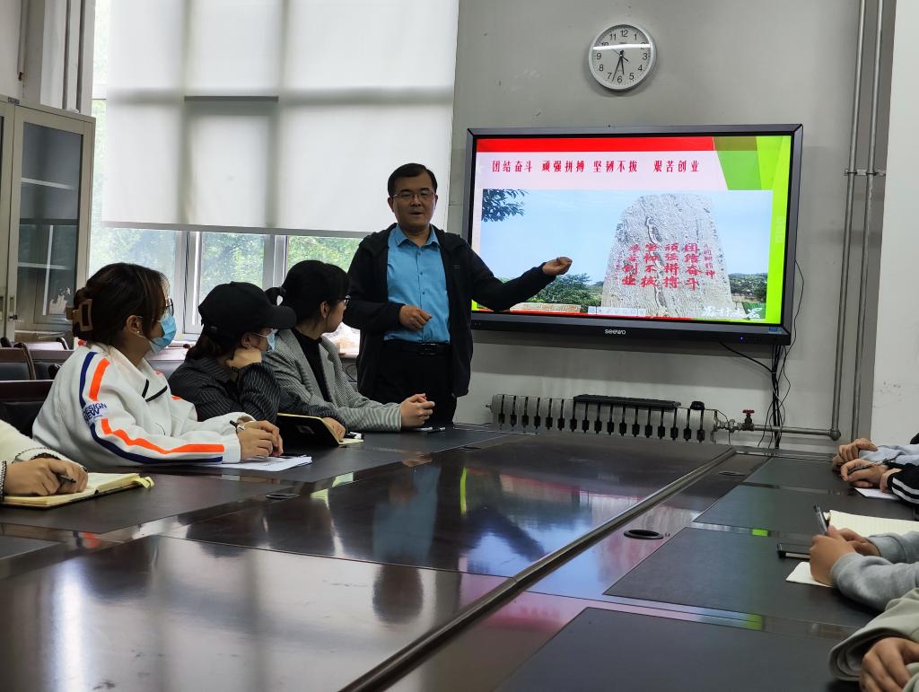 辅导员张磊通过视频、图片向大家讲述了九间棚村的历史变迁和发展历程,特别是上世纪八十年代,以刘嘉坤为首的九间棚村党支部不甘于贫穷落后,穷则思变,宁愿苦干,不愿苦熬,带领全村架电、修路、整地、栽树开展的“治穷”工程。绝壁穿石,开山劈路,填壑造田,引水上山,靠着坚忍不拔的拼搏精神,把穷山恶水的山巅小村,变成了山清水秀、桃红梨白、风景宜人、地肥户富的社会主义新农村,九间棚村也成为“全国文明村”、“中国幸福村”、“全国生态文化村”,凝结培育了“团结奋斗,顽强拼搏,坚韧不拔,艰苦创业”的“九间棚精神”。“九间棚精神”诠释了共产党员不忘初心、牢记使命的理想信念,体现了共产党人不畏艰险、实干苦干的优良作风,证明了面对困难锲而不舍、金石可镂的普遍真理。张磊以习近平总书记在《庆祝中国共青团成立100周年大会上的重要讲话》中的“青年犹如大地上茁壮成长的小树,总有一天会长成参天大树,撑起一片天”勉励同学们要发扬“九间棚精神”,不断锻炼磨砺,提升自身能力和素质,为社会主义现代化国家建设贡献青春和智慧。