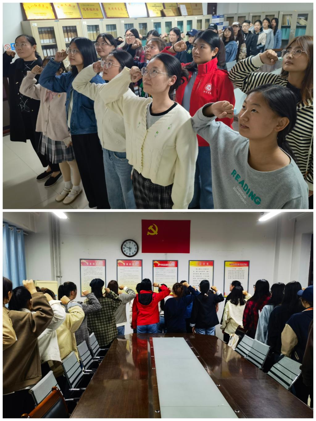 最后,在鲜红的党旗下,全体党员举起右手,握紧拳头,由姜璨领誓,重温入党誓词,每一位党员再一次接受了心灵的洗礼。