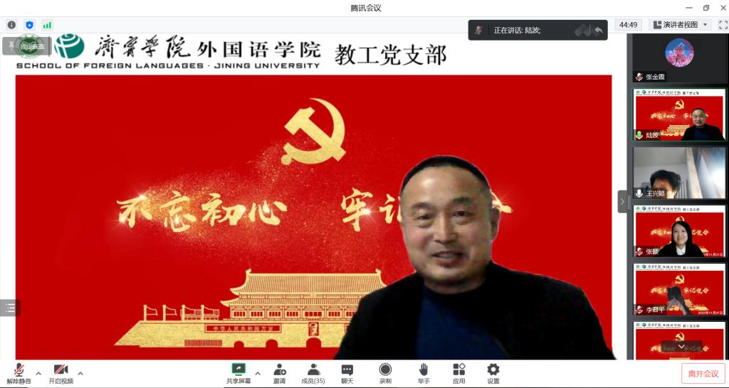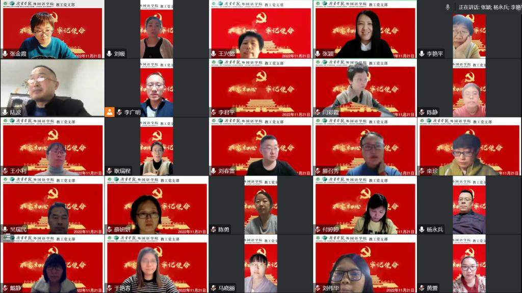 11月21日晚上7:30-8:30,mksport登录入口教工党支部在腾讯会议召开了全体党员会议,举办“书记讲党课”、重温入党誓词活动。mksport登录入口党委书记陆波、党委副书记许言强、教工党支部书记张颖及全体教工党员参加了学习交流会,会议由教工党支部书记张颖主持。