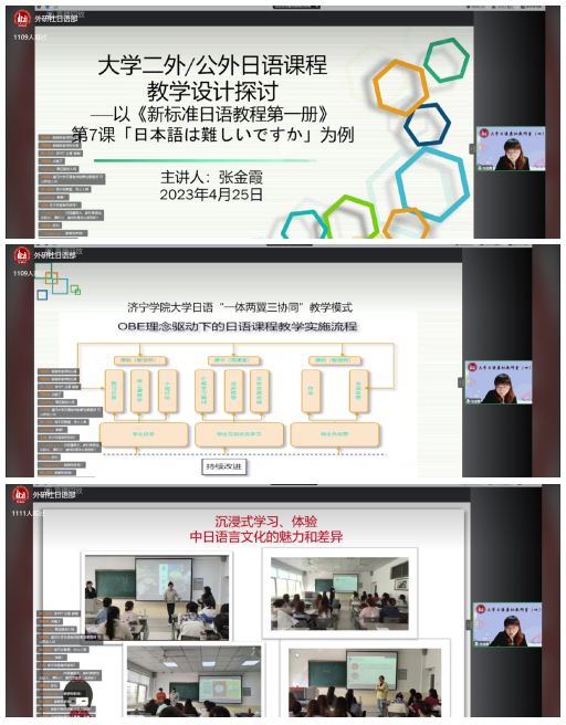 张金霞老师结合个人主持的山东省一流本科课程——日语(第二外语)的建设经验,推介了济宁学院大学日语“一体两翼三协同”教学模式,从教学设计、教学过程展示、教学反思等三方面进行了分享,时长45分钟。主题教学设计兼顾知识的系统性、学习的趣味性、学生的承受能力,为在线教师提供了立体、生动的教学设计示范,获得了与会专家、教师的好评。