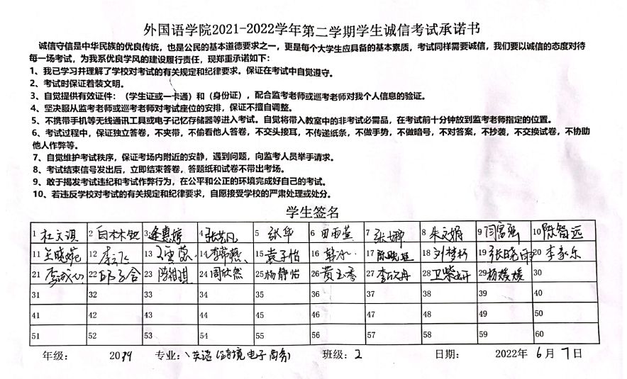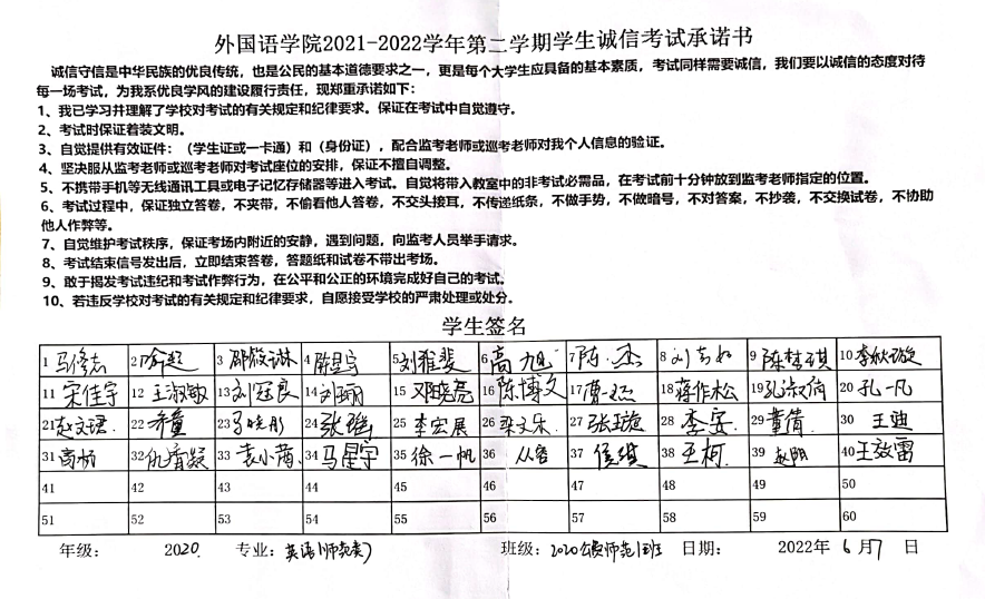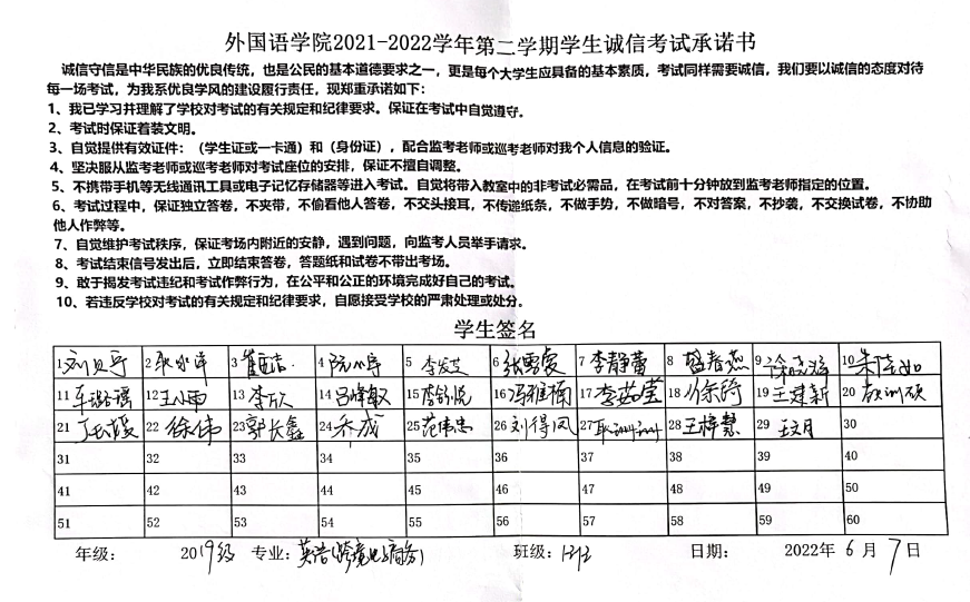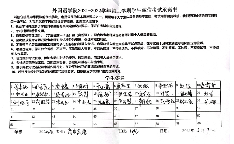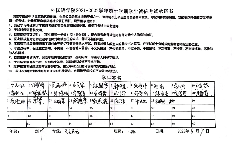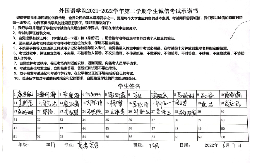 姜璨带领大家认真学习《济宁学院学生手册》中学生纪律处分办法,并强调,考试不仅是对学习情况的评价,更是对诚信品质的检验。同学们应该树立诚信意识,形成良好的学风和考试纪律,认清考试舞弊行为的危害性和不可弥补的严重后果,情节严重可导致取消学位证、毕业证甚至开除学籍。随后,全体学生签署《诚信考试承诺书》。同学们纷纷表示,牢记“拒绝作弊,诚信考试”的倡议,严格遵守考试管理规定,拒绝作弊行为,真实展现自己的学习成果。
