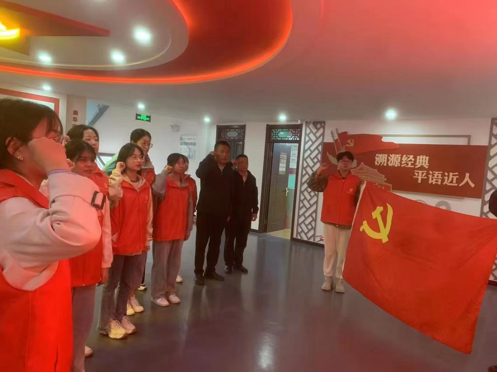 鲁源新村是一个具有光荣革命传统的老区村庄。为了缅怀革命烈士,发挥红色资源,更好地教育子孙后代,该村自筹资金办起了革命村史展馆,以本村革命史料为依托,用图文形式展示村庄的革命历史人物和事件。展馆以生动的图文形式展示了这些红色历史,引导学生党员们感受到红色文化的力量和价值。他们通过观看展品、阅读相关史料,深入了解了村庄的革命历史、英雄人物和重大事件,近距离了解了鲁源新村的光荣革命传统,进一步增强了对党的历史和红色基因的认同感。参观后,师生党员肃立庄重,面向党旗,重温入党誓词。