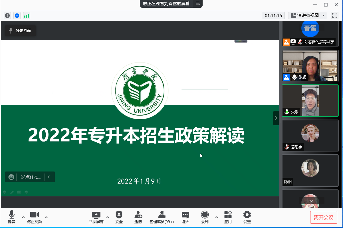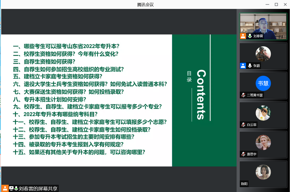 为积极宣传山东省2022年专升本考试招生政策,引导我院英语教育专业应届毕业生积极参加专升本考试,1月9日晚,mksport登录入口利用腾讯会议召开2022年专升本考试招生政策解读线上会议。外院党委副书记许言强、副院长张颖、教学秘书刘春雷、2018级专科毕业生代表及2019级英语教育专业全体同学参加,辅导员田清敏主持会议。
