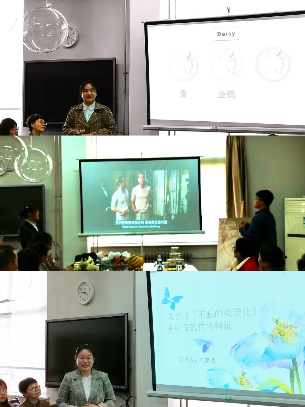 杨楠首先言简意赅地介绍了这本小说的故事梗概。接下来她邀请教师代表孔迁迁和张兴盛分别从“伦理道德”和“消费主义”的视角为大家分享阅读感悟。学生代表刘雅斐、陈博文也分别以“小说叙事角度”和“主角梦碎美国”为话题分享了自己的见解。刘冠良、袁小茜同学为来宾献上了精彩的英文原声配音表演,师生共读,其乐融融。
