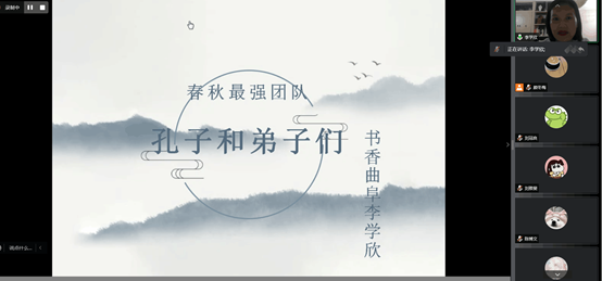 5月13日晚,mksport登录入口外聘教师李学欣为外院学生做了题为“春秋最强团队——孔子和他的弟子们”的线上讲座,让学生们不出校园近距离感受儒家文化,从云端走进《论语》,感悟孔子和弟子们的师生情谊。此次讲座由外院副院长张颖主持,外院师生百余人参加了本次讲座。