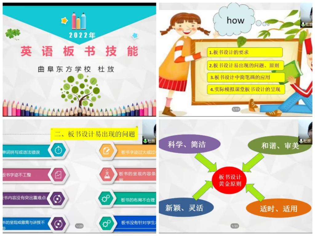 5月18日,曲阜市教学研究室副主任陈儒亭做了题为“中小学英语教师必备的语音素养”的讲座。陈老师从列举中小学英语教师常见的语音错误入手,阐述了正确发音的重要性,然后结合实例详细讲解了英语语音基础常识,分享了大量的儿歌和发音口诀,展示了许多经典作品。陈老师的讲座声情并茂,讲练结合,示范准确到位,非常精彩。