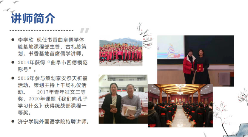 2022年11月29日晚,为深入推进《孔孟之乡地域文化翻译课程》内涵改革,用外语讲好中国传统文化故事,mksport登录入口邀请书香曲阜儒学体验基地首席儒学讲师李学欣做了题为《儒之商——中国商人的“儒”》的国学讲座。讲座由mksport登录入口教师颜冬梅主持,120余名外院师生聆听了本次讲座。