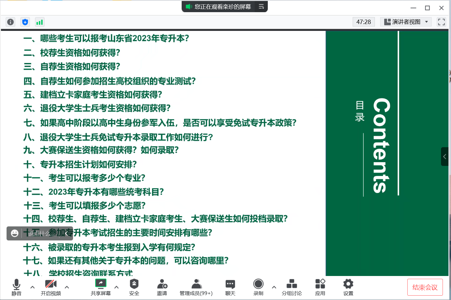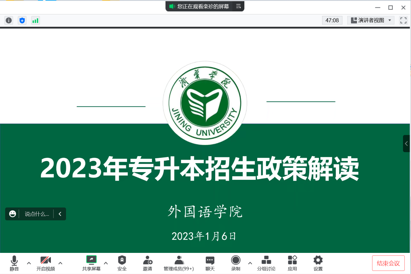 为积极宣传山东省2023年专升本考试招生政策,引导我院英语教育专业应届毕业生积极参加专升本考试,1月6日晚,mksport登录入口利用腾讯会议召开2023年专升本考试招生政策解读线上会议。外院党委副书记许言强、副院长张颖、教学秘书栾珍、教学助理刘暖及2020级英语教育专业全体同学参加,辅导员田清敏主持会议。
