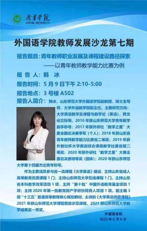 韩冰副教授的报告主要从青年教师职业发展路径探索、教学比赛课程设计、课程建设、团队构建等四个方面展开了精彩的分享。她首先讲到,青年教师在职业发展过程中要坚持学习、深入探索、认真奋斗、多方创新,才能静待花开;参加教学比赛要去除“功利化”,重视过程的积累;中年教师要梳理、系统化已经做了的工作,明确还能做些什么工作。围绕教学比赛课程设计,韩冰副教授提到要重视课程思政的融入,并从课程思政怎么融、怎么深两方面展开了详细的论述。接着,就构建多层次、立体化课程体系,她指出大学英语可以融入学术英语,实现跨学科、融学术的课程建设。最后,她建议外语教师既要了解学生,树立引导、服务意识,也要关注学科发展、实现跨学科发展,还要凝练课程特色,建设具有校本特色的课程。