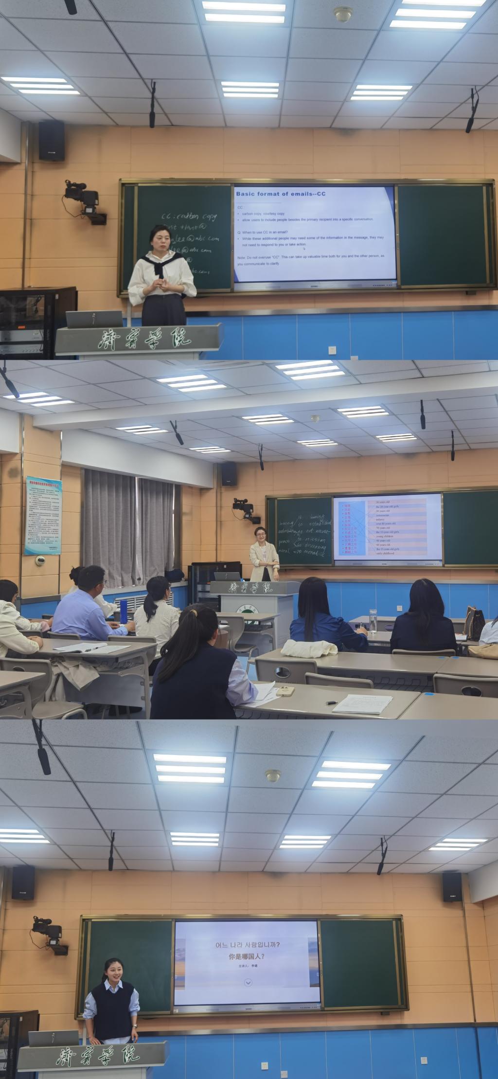 刘暖老师的《商务英语写作》为在场教师带来了一场精彩的教学展示。刘暖的教学设计完整,讲解思路清晰,逻辑性强,赢得了与会教师的一致好评。通过实际案例分析,刘暖引导教师们深入理解商务英语写作的特点和技巧,为提高教学效果提供了有力支持。李华老师带来了《新视野大学英语》第二册第三单元的教学内容。李华巧妙地将中国传统文化知识融入到课堂教学中,不仅丰富了教学内容,也增强了学生的文化自信。这种教学方式激发了学生学习英语的兴趣,同时也提升了他们对中华传统文化的认同感。李璐老师的《基础韩国语》课程以其轻松活泼的风格和简单易学的内容受到了与会教师的一致认可。李璐通过互动式教学,鼓励学生积极参与,有效地提高了学生的学习动力和语言运用能力。