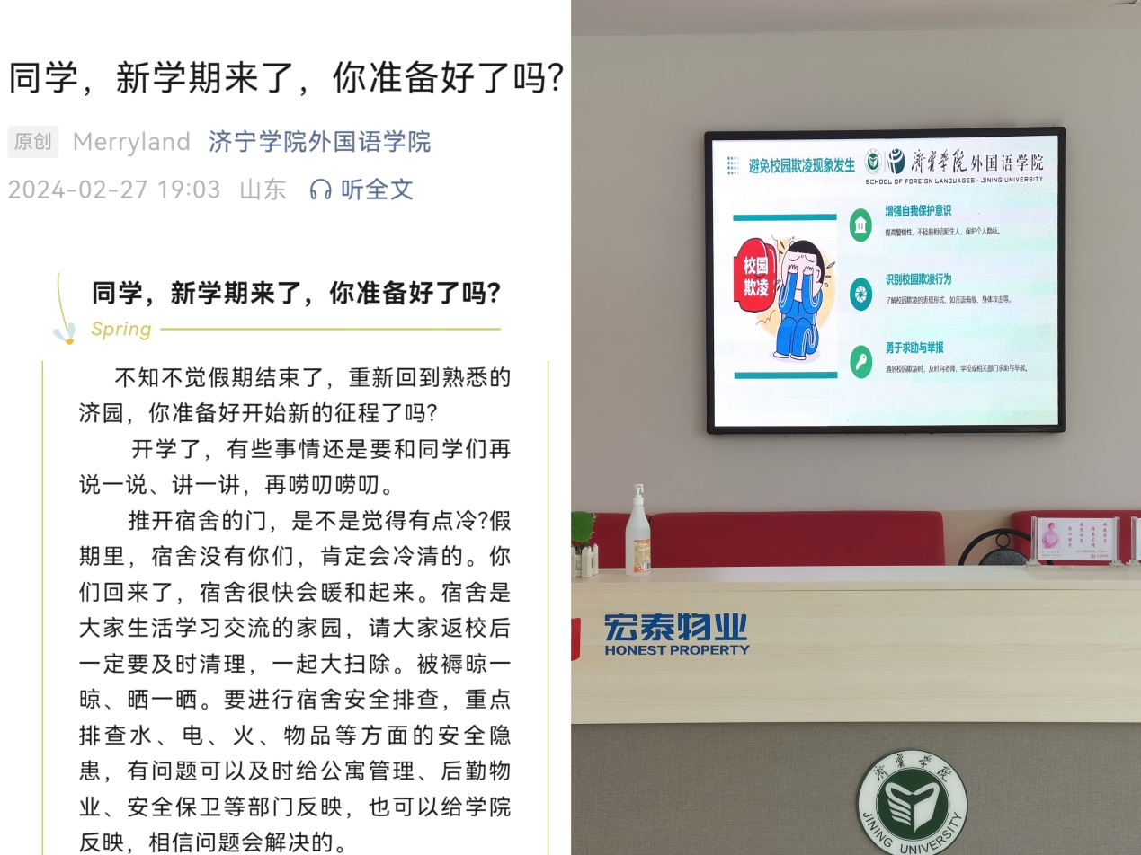 学院公众号发布《同学,新学期来了,你准备好了吗?》推文,以生活活泼的文字引起同学们对防火防盗防诈骗等方面的注意,并提醒同学们做好学业规划、积极参加竞赛、注意强身健体、学会疏导压力,遇见更好的自己。学院还利用大屏幕滚动宣传网络诈骗、个人信息安全、消防安全、交通安全、校园欺凌、心理健康等方面的知识,共同营造文明和谐的校园环境。